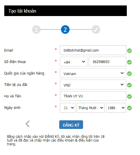Lưu ý bước này liên quan đến giao dịch gửi rút tiền cho nên cần điền đúng thông tin của mình.
