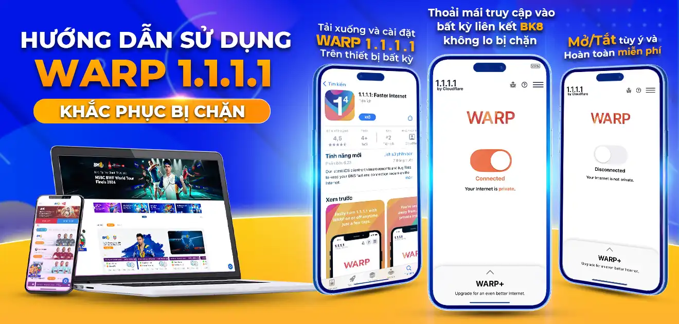 Ứng dụng WARP 1.1.1.1 rất tuyệt vời và là giải pháp tốt nhất để vào nhà cái BK8 không bị chặn cho tốc độ cao nhất.Sau đây là hướng dẫn nhanh cài đặt tải và truy cập BK8